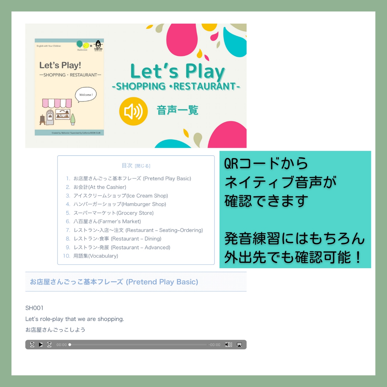 初版であっという間に完売したLet’s play!-Shopping•Restaurant-が待望のリニューアル再販!!!挿絵が加わったり、フレーズ番号がついたりと、より可愛く見やすくなりました♡